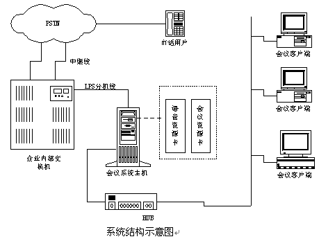 說(shuō)明:如果沒(méi)有企業(yè)內(nèi)部程控交換機(jī)則可以將中繼線直接接在會(huì)議系統(tǒng)主機(jī)上,中繼線可以是普通模擬中繼,也可以是E1接口(如中國(guó)一號(hào)信令、30B+D等)。在與會(huì)議系統(tǒng)主機(jī)的同一網(wǎng)段上可以配置多個(gè)會(huì)議客戶端系統(tǒng),通過(guò)客戶端系統(tǒng)用戶可以隨時(shí)觀察和監(jiān)視會(huì)議系統(tǒng)的使用情況,并且可以建立常用用戶的用戶資料,也可以對(duì)常用用戶進(jìn)行分組,這樣要呼叫某些用戶開(kāi)會(huì)時(shí)只需呼叫組用戶即可;