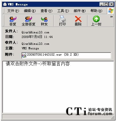 A、電子郵件檢索:語(yǔ)音留言可以以Email方式,發(fā)送到信箱主人的郵箱中,用戶可以使用Outlook、Foxmail或其它郵件方式,以附件方式收取個(gè)人的語(yǔ)音留言,通過PC上的揚(yáng)聲器、耳機(jī)來(lái)收聽消息。