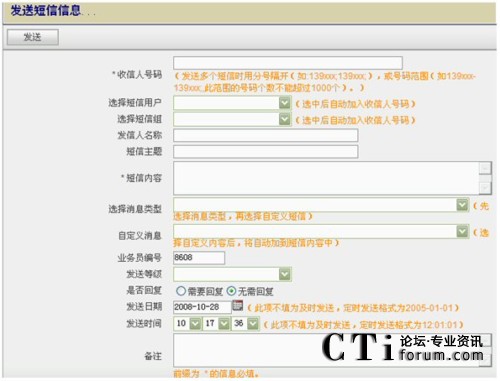 - 群發(fā)短信:通過個(gè)人的Web方式的客戶端給系統(tǒng)預(yù)先設(shè)置好的用戶組或?qū)懭攵鄠(gè)對(duì)方手機(jī)號(hào)碼發(fā)送短信;