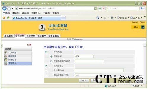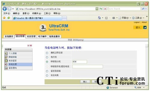 信箱主人通過Web方式的客戶端,根據(jù)實(shí)際需要,將來(lái)話設(shè)置為轉(zhuǎn)接到不同的目標(biāo),如:語(yǔ)音信箱留言、內(nèi)部其它分機(jī)、轉(zhuǎn)移至手機(jī)、轉(zhuǎn)移至外線;
