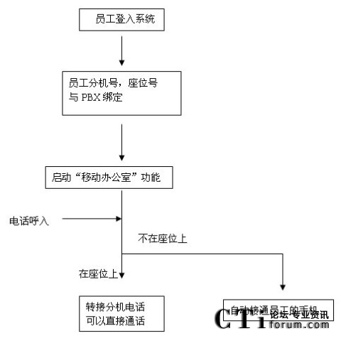 每個(gè)需要到企業(yè)辦公的員工,可以通過門禁系統(tǒng),或?qū)iT一臺(tái)PC上進(jìn)行登入,通過后由系統(tǒng)自動(dòng)分配或員工選擇一個(gè)空閑的座位,座位號(hào)與員工的分機(jī)號(hào)碼綁定,所有對(duì)這個(gè)員工分機(jī)的呼叫均被自動(dòng)轉(zhuǎn)移到其座位上的辦公電話上;