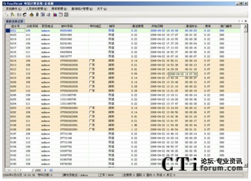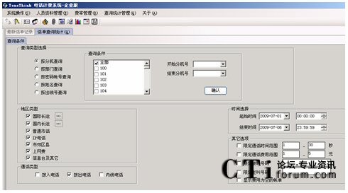 系統(tǒng)提供多種查詢條件,進(jìn)行話單明細(xì)和話單結(jié)算的統(tǒng)計(jì),如:按分機(jī)、部門、密碼、職員名稱、出現(xiàn)號(hào)碼、通話時(shí)間范圍、通話費(fèi)用范圍、制定主叫、制定被叫、不同的通話類型(國(guó)內(nèi)長(zhǎng)途、國(guó)際長(zhǎng)途、市話、IP等)。