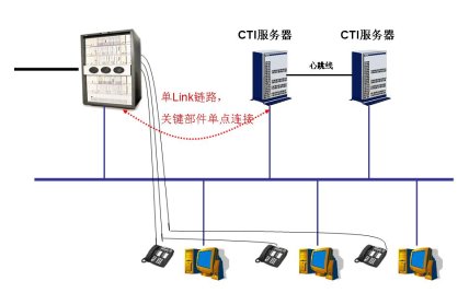 中汽網(wǎng)呼叫中心采用了Hi-Link產(chǎn)品的鏈路級雙機(jī)熱備解決方案,為核心部件CTI提供真正可靠的保障。以往的CTI產(chǎn)品在與PBX連接的時候,都是采用PBX廠家提供的“API層”接口,該接口只能部署到一臺服務(wù)器上,進(jìn)而也使得采用雙機(jī)熱備方案的CTI服務(wù)器存在單點(diǎn)故障,如圖所示: