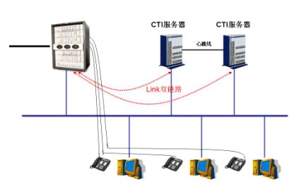 采用Hi-Link鏈路級雙機(jī)備份機(jī)制可有效地防止呼叫中心系統(tǒng)單點(diǎn)故障的發(fā)生。呼叫中心兩臺互為熱備的CTI系統(tǒng)通過獨(dú)立的CTI Link鏈路連接到交換機(jī),使得該雙機(jī)熱備方案真正成為無單點(diǎn)故障的熱備方案。系統(tǒng)框圖如下: