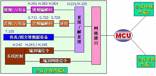 如圖所示:視頻會議終端將輸入進來的視頻使用H.261、H.263或H.264協(xié)議、音頻使用G.711、G.722或G.728、數(shù)據(jù)、控制信令進行單獨編碼,然后將編碼后的數(shù)據(jù)進行“復用”打包后形成遵循網(wǎng)絡協(xié)議的數(shù)據(jù)包,通過網(wǎng)絡接口傳到MCU供選擇廣播。從MCU傳來的其他會場的數(shù)據(jù)包通過“解復用”,分別還原成視頻、音頻以及數(shù)據(jù)及控制信令分別相應的輸出設備上回顯或執(zhí)行。