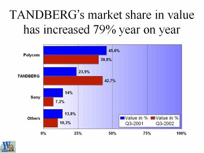 產(chǎn)地挪威,該品牌為視頻會議業(yè)界的高端產(chǎn)品。該品牌全系列均屬第三代產(chǎn)品,具有多項視頻會議的首創(chuàng)技術,最高功耗只有65W,最高帶寬3M,是美國國防部、加拿大國防部、聯(lián)合國教科文組織、歐洲多個國家王室及大型跨國集團選用的品牌,F(xiàn)在全球市場占有量第一位(依據(jù)2002年第3季度資料)。