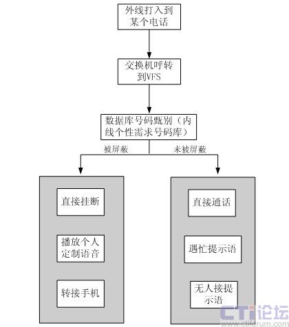 - 系統(tǒng)利用交換機(jī)的話音轉(zhuǎn)移功能,將轉(zhuǎn)移過來的來話信息進(jìn)行過濾處理,從而實(shí)現(xiàn)語音攔截的功能。