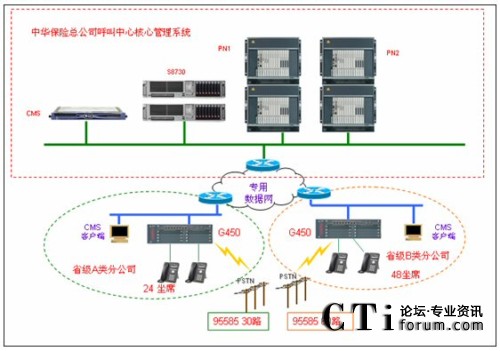 中華保險呼叫中心采用IP分布式架構(gòu),總公司由一套S8730媒體服務(wù)器,4個G650組成2個PN,外加一臺CMS報表服務(wù)器組成。各地分支機(jī)構(gòu)采用G450網(wǎng)關(guān)通過中華保險內(nèi)部數(shù)據(jù)專用網(wǎng)絡(luò)與總公司核心管理系統(tǒng)交互。其中省級B類分公司為60數(shù)字中繼線接入,48坐席。省級A類分公司為30路數(shù)字中繼接入,24坐席。各公司坐席采用AVAYA2410D數(shù)字話機(jī),可以提供豐富的呼叫中心話機(jī)功能,方便坐席人員使用。