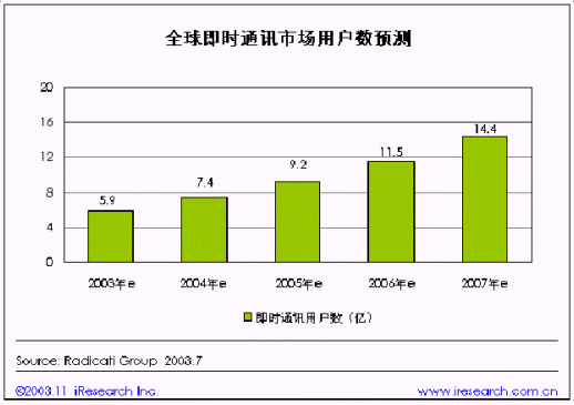 年即時通訊將成為互聯(lián)網(wǎng)上最普及的交流方式。隨著即時通訊的普及,全球即時通訊用戶規(guī)模也在不斷擴(kuò)大。即時通訊市場龐大的用戶規(guī)模和增長潛力早已引起了業(yè)內(nèi)巨頭的激烈競爭。以美國為例,目前,AOL、MSN