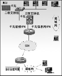 綜合業(yè)務(wù)數(shù)據(jù)網(wǎng)上的信息網(wǎng)VPN,連接省公司和各市公司的局域網(wǎng),桌面終端分布于省市兩級的局域網(wǎng)上。MCU通過三層交換方式接入省公司的信息網(wǎng),實(shí)現(xiàn)各個(gè)桌面會議終端的接入。在信息網(wǎng)上,要設(shè)置路由的QoS,實(shí)現(xiàn)桌面視音頻業(yè)務(wù)的優(yōu)先傳送。