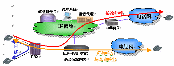 EIP-480設備處于企業(yè)PBX(電話交換機)和PSTN(固定電話網(wǎng))之間。它具有呼叫智能選路功能,支持通過判斷被叫號碼,自動將異地企業(yè)間或外部長途電話旁路到IP網(wǎng)絡上。
