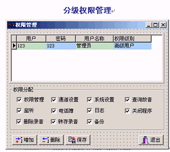 。。通話(huà)錄音或留言進(jìn)行查詢(xún)管理,可按日期、時(shí)間、電話(huà)號(hào)碼、線(xiàn)路、通話(huà)長(zhǎng)度、人員等條件對(duì)錄音進(jìn)行快速檢索、播放,也可將錄音文件進(jìn)行刪除、標(biāo)記、轉(zhuǎn)存、備份等操作。分級(jí)權(quán)限管理