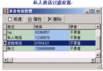 。。通過(guò)對(duì)某些特殊電話(huà)號(hào)碼的禁止錄音設(shè)置,DVS將自動(dòng)過(guò)濾該號(hào)碼進(jìn)行不錄音處理,以滿(mǎn)足私人通話(huà)及特殊場(chǎng)合的需要。