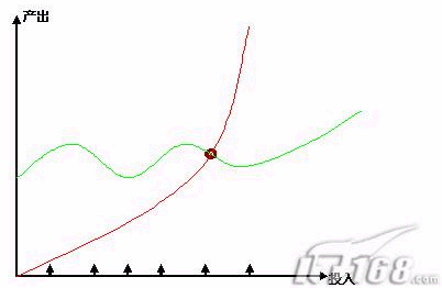 我們可以看到,投入和產(chǎn)出是按月增長(zhǎng)的,那么億美目前呢,是(綠線)慢慢增長(zhǎng)的一個(gè)曲線,隨著投入增加,持續(xù)是一個(gè)規(guī)模性的增長(zhǎng)。這類似一個(gè)2003-2005年,持續(xù)是這樣一個(gè)營(yíng)銷型的穩(wěn)步增長(zhǎng)。那么,從2006年開(kāi)始,這個(gè)地方(棕色)的出現(xiàn),開(kāi)始出現(xiàn)新的變化和新的增長(zhǎng)方式,那么我們說(shuō)這個(gè)點(diǎn)叫做拐點(diǎn)。那么傾斜角度和產(chǎn)出就發(fā)生了變化了。那么比如今后發(fā)展到一個(gè)階段,新的平臺(tái),新的內(nèi)容出來(lái)后,那么這個(gè)拐點(diǎn)也同樣會(huì)發(fā)生變化。