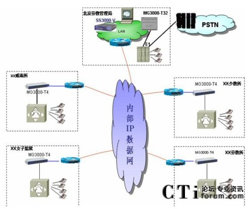 根據(jù)北京監(jiān)獄管理局情況大唐高鴻提出在監(jiān)獄系統(tǒng)現(xiàn)有的網(wǎng)絡建立IP語音系統(tǒng),使各地監(jiān)獄之間的語音服務運營在現(xiàn)有完善的IP網(wǎng)絡上,實現(xiàn)“語音、數(shù)據(jù)、視頻三網(wǎng)合一”的先進網(wǎng)絡。