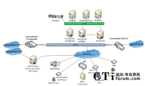 計(jì)費(fèi)系統(tǒng)將把視頻通話和普通的語(yǔ)音通話分開來計(jì)費(fèi),視頻會(huì)議業(yè)務(wù)也可以作為一項(xiàng)特殊業(yè)務(wù)單獨(dú)計(jì)費(fèi)。所有這些業(yè)務(wù)都使用相同的計(jì)費(fèi)和OAM系統(tǒng)。在這個(gè)運(yùn)營(yíng)商級(jí)軟交換系統(tǒng)中,已經(jīng)把視頻業(yè)務(wù)完全集成進(jìn)了系統(tǒng)。下面是網(wǎng)絡(luò)示意圖: