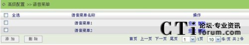 點(diǎn)擊“高級(jí)配置”菜單的“語音菜單”子菜單,進(jìn)入語音菜單頁(yè)面,頁(yè)面默認(rèn)顯示系統(tǒng)已經(jīng)配置的所有語音菜單列表信息,在這里用戶可以創(chuàng)建新的語音菜單、修改刪除已有的語音菜單,如下圖所示: