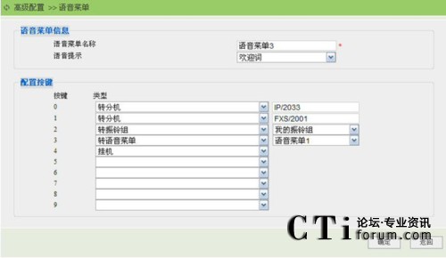 在此頁(yè)面可以定義語音菜單的名字,可以指定進(jìn)入此菜單后播放的音樂,還可以為每個(gè)鍵選擇合適的操作。支持0-9數(shù)字按鍵定義,每個(gè)鍵可選擇如下五個(gè)動(dòng)作之一: