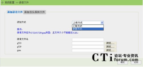 在定制語音菜單時(shí),經(jīng)常要提供聲音文件,目前系統(tǒng)支持G.723、G.729和gsm(針對(duì)G.711a和G.711u)類型的語音文件和音樂保持文件,單個(gè)文件大小不能超過512K。MG3000-X中的語音文件可以通過錄制或者上傳方式提供。