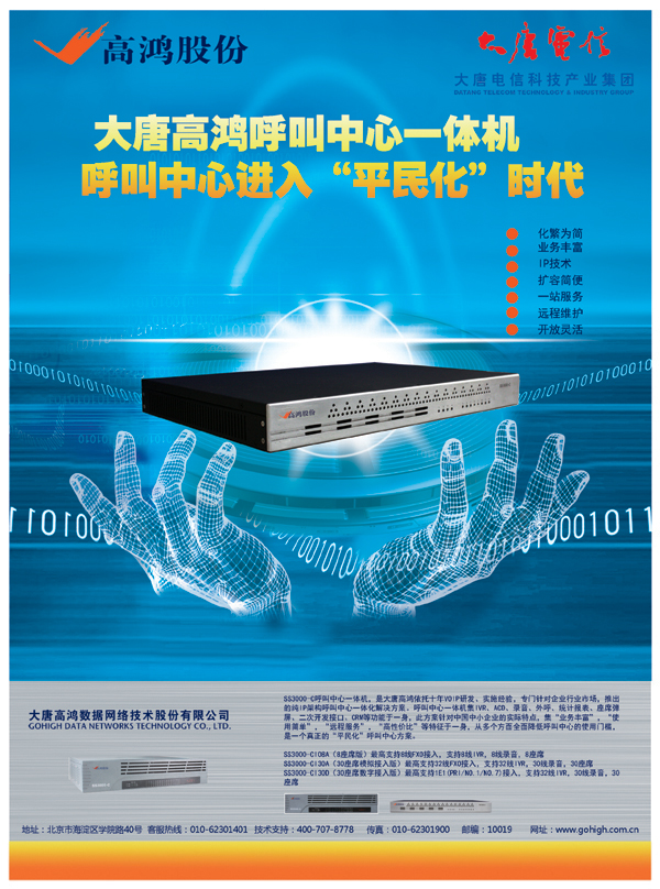 IP語(yǔ)音通信領(lǐng)域的專(zhuān)家,CTI市場(chǎng)的新銳,大唐高鴻公司在IP呼叫中心市場(chǎng)繼續(xù)大力投入,新推出的一體化IP呼叫中心產(chǎn)品集強(qiáng)大功能與便捷性于一身,為企業(yè)自建呼叫中心首選.