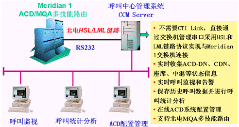 華呼CCM系統(tǒng)不需要Meridian Link,直接通過(guò)交換機(jī)管理串口采用HSL(High-Speed Link)和LML(Load Management Link)鏈路協(xié)議實(shí)現(xiàn)與Meridian 1交換機(jī)連接;實(shí)時(shí)收集ACD座席、隊(duì)列、中繼等狀態(tài)信息,提供實(shí)時(shí)監(jiān)控和告警;保存各類(lèi)歷史呼叫數(shù)據(jù),提供多種統(tǒng)計(jì)分析手段;提供ACD有關(guān)參數(shù)的實(shí)時(shí)和預(yù)定配置管理功能;支持北電MQA(Multiple Queue Assignment)技能路由功能,使座席可同時(shí)登錄到5個(gè)ACD隊(duì)列,在交換機(jī)內(nèi)部實(shí)現(xiàn)技能路由;對(duì)各類(lèi)數(shù)據(jù)分析以表格、直方圖、餅圖等方式進(jìn)行直觀顯示并可進(jìn)行打印,以及提供多樣的告警提示。