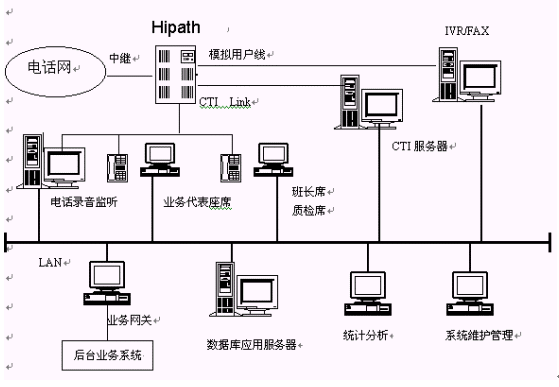 主要包括:Siemens Hipath 3000系列交換機(jī)、CTI服務(wù)器、IVR/FAX服務(wù)器、業(yè)務(wù)代表座席、班長(zhǎng)和質(zhì)檢座席、電話錄音監(jiān)聽(tīng)系統(tǒng)、數(shù)據(jù)庫(kù)應(yīng)用服務(wù)器、業(yè)務(wù)網(wǎng)關(guān)、統(tǒng)計(jì)分析工作站、系統(tǒng)維護(hù)管理工作站、網(wǎng)絡(luò)系統(tǒng),其邏輯結(jié)構(gòu)下圖所示。