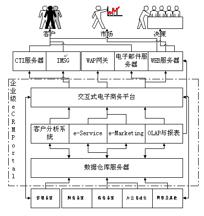 交互式電子商務(wù)平臺(tái):負(fù)責(zé)將企業(yè)內(nèi)部的系統(tǒng)和企業(yè)的電子渠道(如:WEB、電子郵件、WAP、手機(jī)短消息和呼叫中心(Call Center)等)與企業(yè)內(nèi)部的業(yè)務(wù)系統(tǒng)(如:銷(xiāo)售系統(tǒng)、ERP系統(tǒng))等連接起來(lái)共同為客戶(hù)提供更為有效的服務(wù)。