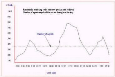 Inbound的來話量成不規(guī)則的波形圖,形成這種不規(guī)則波形圖中波峰和波谷的原因是在這些波峰和波谷工作的員工數(shù)量。(見圖8.來話量的分布圖)這將對在一天中的每個時段能夠分配最理想的員工來工作造成了最大的困難。一個小時能可能從來話量的波峰到達波谷,管理人員如何排班來匹配話務(wù)量對人員的要求,這是很多人的困惑。下圖描繪了某個呼叫中心8小時來話量分布情況。