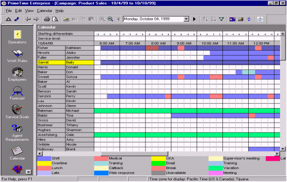 人員預(yù)測是一個每天、每周、每月、每年都需要作的工作計劃,為了能夠平衡呼叫中心人員的工作量和人員的可用性。通過將歷史數(shù)據(jù)和人員數(shù)據(jù)整合、加以分析,并借以WFMS體現(xiàn)出分配多少員工就可以達到既定的服務(wù)水準(zhǔn)。一旦需要員工數(shù)量被估算出來,那么工作安排也就是每天、每周、每月、每天的排班表的輪廓也就出來了。絕大多數(shù)的WFMS軟件的界面和操作都很相似,最主要的就是內(nèi)容就是要包含員工的姓名、員工的工作時間、員工的其他日程(最小單位是15分鐘),并且能夠提供具有多個管理軟件接口,和多種不同的管理方式。圖9.就是一個典型的人員排班表,以15分鐘為單位體現(xiàn)人員的工作安排。附加選項還可以包含"休假""遲到""曠工"等等,并且這排班表還可以通過歷史數(shù)據(jù)體現(xiàn)出哪個時段可能出現(xiàn)人員不足哪個時段容易出現(xiàn)人員過,F(xiàn)象。