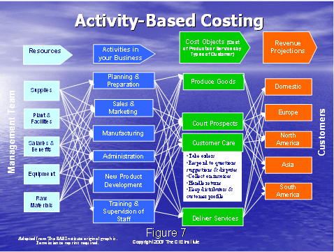 通過(guò)了解圖8,我們將以行動(dòng)成本管理大體是什么的總括作為結(jié)束。我們從左邊的成本驅(qū)動(dòng)因素開(kāi)始——這是做工作的原因,例如:獲得客戶,維持客戶。就如圖4中所說(shuō)的,這些成本驅(qū)動(dòng)因素可以細(xì)分到工作行動(dòng)上去?梢酝ㄟ^(guò)描述人,培訓(xùn),設(shè)備和技術(shù)資源來(lái)組成工作行動(dòng)。資源驅(qū)動(dòng)因素被用于分配這些企業(yè)成本到各個(gè)行動(dòng)上去。下一步就是系統(tǒng)地確定行動(dòng)驅(qū)動(dòng)因素,分配行動(dòng)成本到成本對(duì)象上去,這有利于決策的制定。例如,獲得一個(gè)客戶和維持一個(gè)客戶需要花費(fèi)多少的成本?