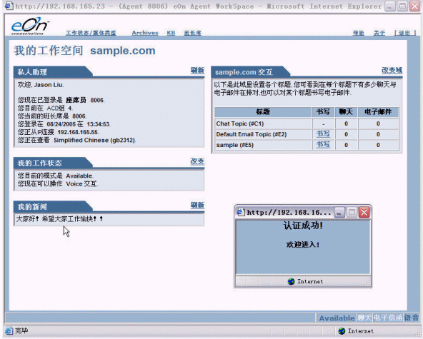 上圖是eQueue坐席員的標準工作界面,其中左側(cè)包含的信息有:坐席員個人資料、隸屬的坐席組、工作狀態(tài)、可服務的媒體類型、系統(tǒng)公告;右側(cè)有隊列中處于等待狀態(tài)的呼叫請求數(shù)量。界面上方設置有益昂公司特色的知識庫(KB)鏈接,單擊鏈接可以查找到客戶所關心問題的標準回復內(nèi)容。在這個界面里,坐席員可以完成包括語音呼叫、電子郵件在內(nèi)的所有工作。