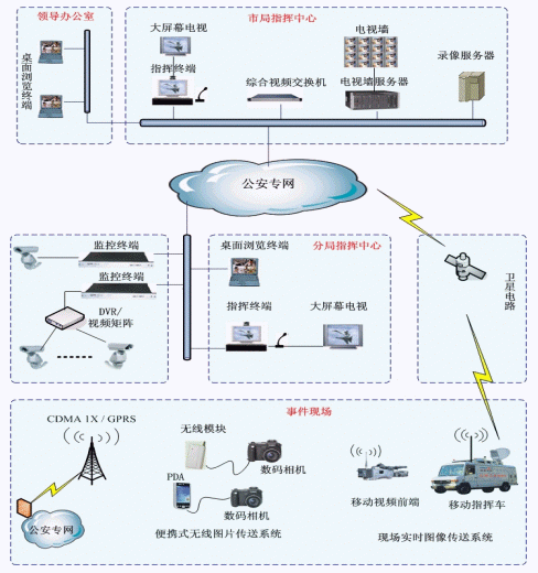 系統(tǒng)分3個層次,市局指揮中心、區(qū)縣分局(交警、消防)指揮中心、移動指揮終端(現(xiàn)場指揮中心),主要設(shè)備包括:綜合視頻交換機(jī)、指揮終端、監(jiān)控終端、電視墻服務(wù)器、存儲錄像服務(wù)器、瀏覽終端、移動視頻前端、搞清晰圖片傳輸系統(tǒng)等。系統(tǒng)結(jié)構(gòu)如圖示。
