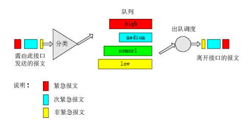 在報文到達(dá)路由設(shè)備接口后首先對報文進(jìn)行分類,然后按照報文所屬的類別讓報文進(jìn)入所屬隊列的尾部,在報文發(fā)送時按照優(yōu)先級總是在所有優(yōu)先級較高的隊列中的報文發(fā)送完畢后再發(fā)送低優(yōu)先級隊列中的報文,這樣在每次發(fā)送報文時總是將優(yōu)先級高的報文先發(fā)出去,保證了屬于較高優(yōu)先級隊列的報文有較低的時延與丟失率。