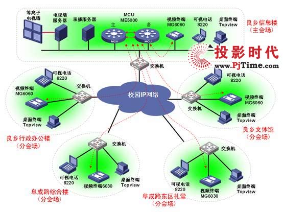 ME5000(配置32*768K)型MCU,在主會場及各分會場會議室共配置9臺高清會議室型會議終端(MG6060)和4臺標清會議室終端(MG6030);同時學(xué)校領(lǐng)導(dǎo)桌面部署120部可視電話和12套桌面終端,具體視頻會議組網(wǎng)拓撲圖如下所示: