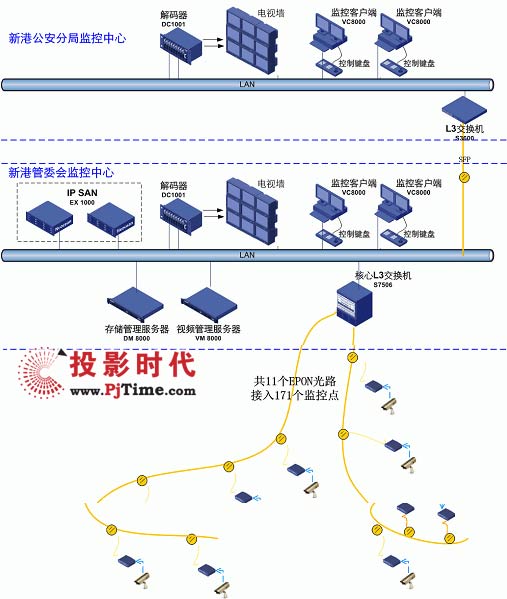 除了攝像頭與圖像顯示設備之外,整個監(jiān)控系統(tǒng)主要采用的都是H3C設備。系統(tǒng)用11(應改成10條,最終只用了10條)條EPON光路接入全部171個監(jiān)控攝像頭;并采用專業(yè)的EX1000存儲產品為120T關鍵歷史視頻數(shù)據(jù)的提供了高可靠性的存儲保護;而S7506、S3600交換機優(yōu)化的組播特性和特色的雙流技術則確保了所有監(jiān)控點的高清晰、高實時性、支持大量并發(fā)訪問。系統(tǒng)的集中管理、批量配置、全網網管也可以為新港開發(fā)區(qū)節(jié)省管理成本。