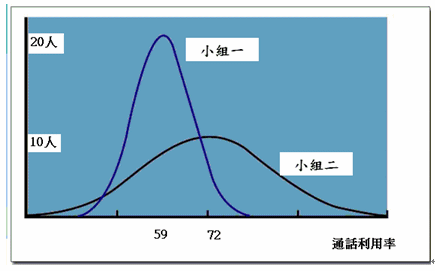 我們先看小組一,小組一的平均通話利用率是59,有20人達(dá)到了59這個(gè)通話利用率(請(qǐng)看縱軸的20人這刻度),剩下一半的人比59這平均數(shù)高,另外一半的人比59這平均數(shù)低。