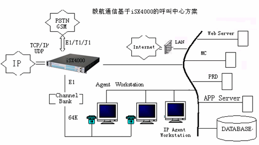相對(duì)于現(xiàn)在的兩種主流呼叫中心方案,毅航通信基于iSX4000呼叫中心解決方案直接整合了Internet的接入。傳統(tǒng)由IVR完成的操作也可以通過(guò)Web頁(yè)面上的流程實(shí)現(xiàn),這樣用戶通過(guò)下拉菜單、簡(jiǎn)單填寫(xiě)、點(diǎn)擊按鈕等操作完成客戶識(shí)別、業(yè)務(wù)識(shí)別等操作,這些流程完成后,通過(guò)VoIP對(duì)呼叫中心呼入,由呼叫中心對(duì)呼入進(jìn)行受理,再按照相應(yīng)的原則分配到座席,座席再作相應(yīng)的應(yīng)答和處理,從而為客戶提供了一個(gè)通過(guò)Web站點(diǎn)直接進(jìn)入呼叫中心的途徑,把Internet所具有的豐富信息資源和強(qiáng)大的功能賦予呼叫中心,它向客戶提供一個(gè)可訪問(wèn)的Web站點(diǎn),使得呼叫中心從“撥叫到交談(Dial to Talk)”發(fā)展到“點(diǎn)擊到交談(Click to Talk)”,通過(guò)Internet可以提供IP電話語(yǔ)音呼叫、Call Back、IP傳真、IM、E-mail等功能,擴(kuò)展了通信渠道,一方面用戶可以實(shí)現(xiàn)免費(fèi)接入到呼叫中心,另一方面企業(yè)能夠向更多的客戶提供優(yōu)質(zhì)、方便的服務(wù)資源,而且由于這些資源的價(jià)格相對(duì)傳統(tǒng)通信便宜,使企業(yè)為客戶提供全國(guó)、乃至于全球服務(wù)成為可能,提高了企業(yè)客戶服務(wù)水平,增強(qiáng)了企業(yè)競(jìng)爭(zhēng)力。毅航通信統(tǒng)一呼叫中心解決方案系統(tǒng)結(jié)構(gòu)如圖所示: