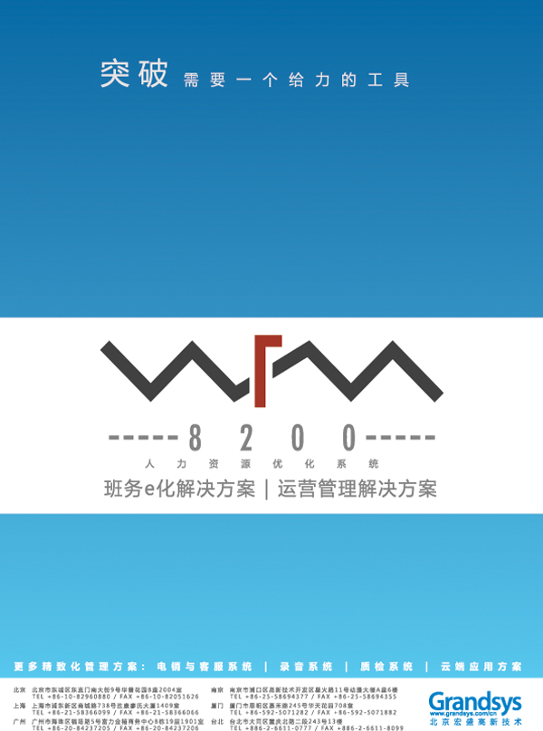 Grandsys 有最堅(jiān)強(qiáng)的設(shè)計(jì)研發(fā)團(tuán)隊(duì),以16年豐富的行業(yè)知識(shí)為基礎(chǔ),發(fā)展自有品牌應(yīng)用軟件與專業(yè)服務(wù)事業(yè),盛大推出LOG8000KS錄音與關(guān)鍵詞辨識(shí)分析系統(tǒng)、QMS8100KS質(zhì)檢與關(guān)鍵詞辨識(shí)分析系統(tǒng)、WFM8200人力資源優(yōu)化管理系統(tǒng)、和eVoice8300電話營(yíng)銷與客戶服務(wù)系統(tǒng),為企業(yè)打造完整的呼叫中心管理平臺(tái)。