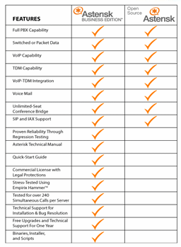 Dial by Name Direct Inward System Access Distinctive Ring Distributed Universal Number Discovery (DUNDi™) Do Not Disturb E911 ENUM Fax Transmit and Receive (3rd Party OSS Package) Flexible Extension Logic Interactive Directory Listing Interactive Voice Response (IVR) Local and Remote Call Agents Macros Music On Hold Music On Transfer Flexible Mp3-based System Random or Linear Play Volume Control Predictive Dialer Privacy Open Settlement Protocol (OSP) Overhead Paging Protocol Conversion |