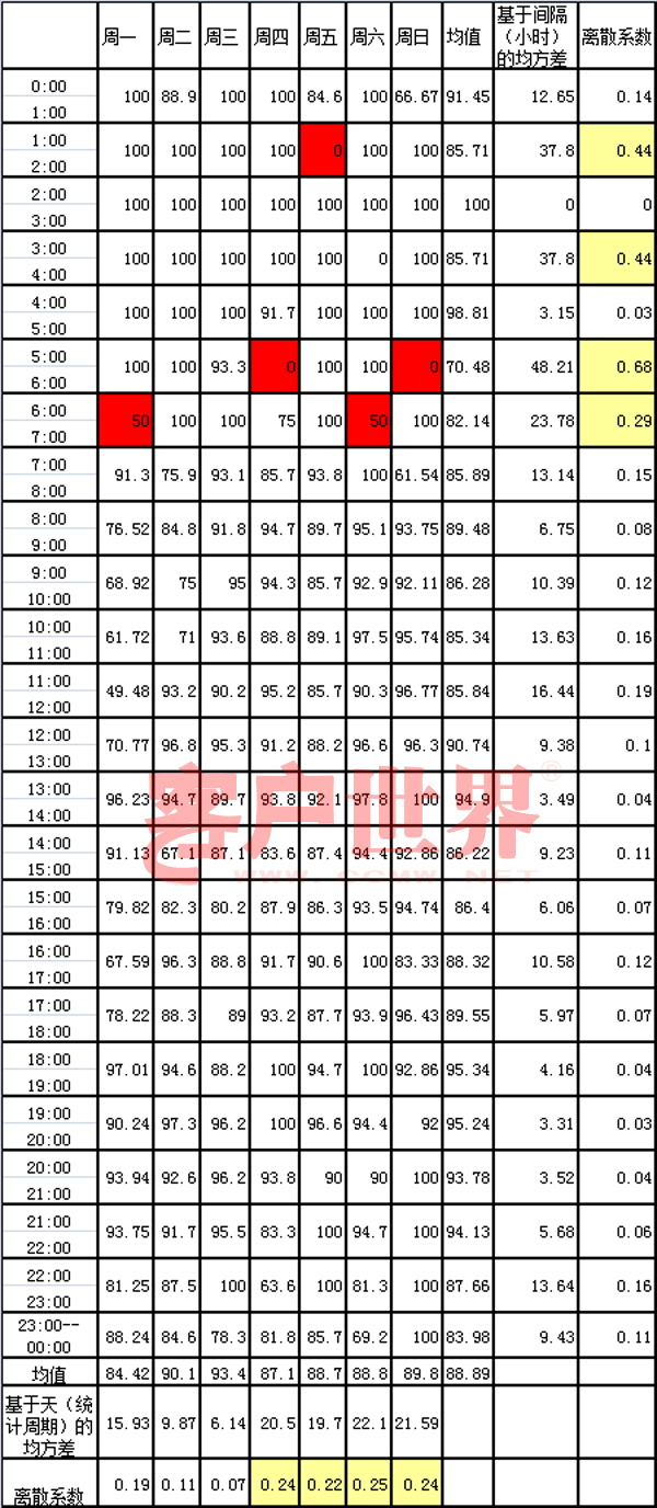 針對平均服務(wù)水平的不足,大家開始采用服務(wù)水平均方差來衡量運營的好壞。服務(wù)水平均方差又分為兩種,一種是按時間間隔的均方差分析,即統(tǒng)計相同時間間隔在不同日期間的服務(wù)水平均方差;一種是按統(tǒng)計周期的均方差分析,即統(tǒng)計周期內(nèi)不同時間間隔的均方差。