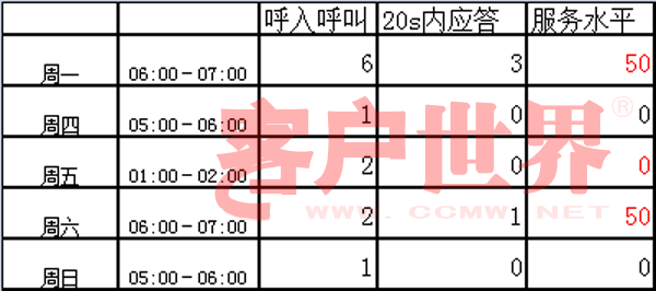 附表1是某一客服中心在一周內(nèi)分時段服務(wù)水平的詳細數(shù)據(jù),通過統(tǒng)計平均值及均方差,可以很清晰的看出問題所在。以基于統(tǒng)計周期的均方差為例,很明顯周四到周日的離散系數(shù)偏高,可以很明顯的看出,這幾天或者是人力安排有問題,或者是話務(wù)有異常。而從基于時段的均方差來看,凌晨(0:00-7:00)出現(xiàn)異常的幾率最大。結(jié)合均值和均方差可以很方便的分析出呼叫中心的宏觀狀態(tài),但是,要想對呼叫中心業(yè)務(wù)運營有所幫助,必須進行進一步的分析。即結(jié)合業(yè)務(wù)及話務(wù)量實際形態(tài)進一步分析。還以附表1為例,如果僅以均方差分析,由于凌晨服務(wù)水平離散系數(shù)大,部分區(qū)間服務(wù)水平為0,是不是夜班需要加人呢?讓我們再看看這幾個異常時段的話務(wù)。