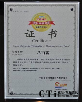 CTI論壇(ctiforum)10月31日消息(記者 張潔):10月19日,2011 秋季CENCE 中國企業(yè)網(wǎng)絡(luò)通信大會暨云計算高峰論壇在上海展覽中心盛大舉行。國內(nèi)首家SaaS廠商八百客憑借連續(xù)在云計算領(lǐng)域的成熟技術(shù)以及在市場中的廣泛認可度,獲得“最佳呼叫中心系統(tǒng)CRM提供商”大獎。