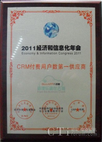 作為全球企業(yè)管理軟件領跑者,八百客參加了此次會議,并就IT業(yè)戰(zhàn)略性發(fā)展、工業(yè)轉型升級等問題和與會企業(yè)家進行了深入探討,集中、深刻闡釋產(chǎn)業(yè)精髓,洞悉和把握未來發(fā)展方向,尋求最佳的信息化成長模式。年會期間的招待晚宴穿插各類年度大獎的頒獎典禮,讓與會的政界、學界、商界等各路貴賓充分交流信息,建立友誼,為達成長期合作奠定良好的基礎;诎税倏驮趪鴥菴RM領域的優(yōu)秀表現(xiàn),本次年會特別授予了八百客“CRM付費用戶數(shù)第一供應商”的大獎。
