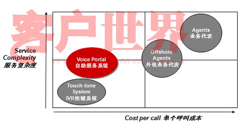 讓我們來看看這張圖。這張圖縱軸是服務(wù)的復(fù)雜度,橫軸是單位呼叫成本,傳統(tǒng)的IVR(觸鍵的語音IVR)和人工服務(wù)相比,服務(wù)的復(fù)雜度可就差多了。而Voice Portal的概念是用比較少的成本做更多的業(yè)務(wù),從成本上講比原來的傳統(tǒng)的IVR可能成本稍微高一點點,但是和人工服務(wù)相比,無論是和單位自建呼叫中心座席比,還是和外包呼叫中心座席比,成本都有很大降低,但業(yè)務(wù)復(fù)雜度可以做得比傳統(tǒng)IVR復(fù)雜很多。我們承認,就提供服務(wù)的內(nèi)容來講,Voice Portal今天仍然不能夠像人工那樣提供那么全面的服務(wù),但是可以涵蓋很多服務(wù)內(nèi)容,在這方面一是因為技術(shù)先進了,另一方面也在于引導(dǎo)。今天我看到越來越多的客戶已經(jīng)開始有意識的推行自助服務(wù)形式。我前幾年去新加坡打出租,發(fā)現(xiàn)在新加坡有很多叫出租的車站,車站上有一個按鍵,按鍵上有一個編碼,說明你在什么位置,當你打通出租車客服的電話,你只要告訴這個編碼,他們就自然而然知道你在什么地方,并把要來接你的車車牌號通過語音報讀方式通知你。今天在中國也開始有這種形式了。昨天我沒有開車,也算是支持北京市每周少開一天車的號召,我打了出租,在和出租司機聊天的過程中,出租司機說現(xiàn)在油價很貴,他們有很強烈的需求不愿意掃馬路,他們也有一個出租車叫車電話,那個呼叫中心大概有上百個坐席,這個公司有一萬六千輛出租車在北京,由他們來進行搶答,搶答完之后你可以告訴說這個人在什么地方等,唯一不同的我們在自助化上還沒有做得那么到位,司機搶到了活還要給客戶打一個電話,不象新加坡完全是自助的,你只要按了那個鍵,系統(tǒng)就知道你在什么地方,當尋找到合適的車的時候,語音報讀你車牌號就行了。我和說出租車師傅,那你打電話成本不是增加了嗎,他一笑,增加打一個電話的成本怎么也比掃馬路強。大家可以看看呼叫中心多有用,自助服務(wù)能省多少錢。