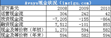 2008、2009、2010財(cái)年Avaya公司運(yùn)營(yíng)現(xiàn)金流分別為3.04億美元、2.42億美元、4200萬(wàn)美元,2010財(cái)年運(yùn)營(yíng)現(xiàn)金流急劇減少因并購(gòu)北電的企業(yè)通信部門(mén)(NES)影像所致,截至2010財(cái)年(即2010年9月30日)Avaya公司現(xiàn)金及等價(jià)物為5.94億美元。