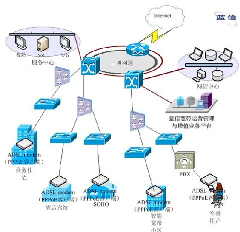 在以以太網(wǎng)技術(shù)為主建設(shè)的運(yùn)營區(qū)域,在中心由一臺模塊化的核心交換機(jī)支持,輔以多臺BASE設(shè)備連接,在接入層用交換機(jī)做接入設(shè)備,保證用戶數(shù)據(jù)的快速傳播。在網(wǎng)絡(luò)核心處,部署信利公司的藍(lán)信寬帶認(rèn)證計(jì)費(fèi)系統(tǒng),負(fù)責(zé)對全網(wǎng)用戶的安全認(rèn)證、計(jì)費(fèi)及管理。藍(lán)信寬帶認(rèn)證計(jì)費(fèi)系統(tǒng)除支持標(biāo)準(zhǔn)的RADIUS協(xié)議外,還支持PPPoE、802.1x認(rèn)證。在用戶終端處,部署藍(lán)信特制的PPPoE客戶端,實(shí)現(xiàn)撥號上網(wǎng)。