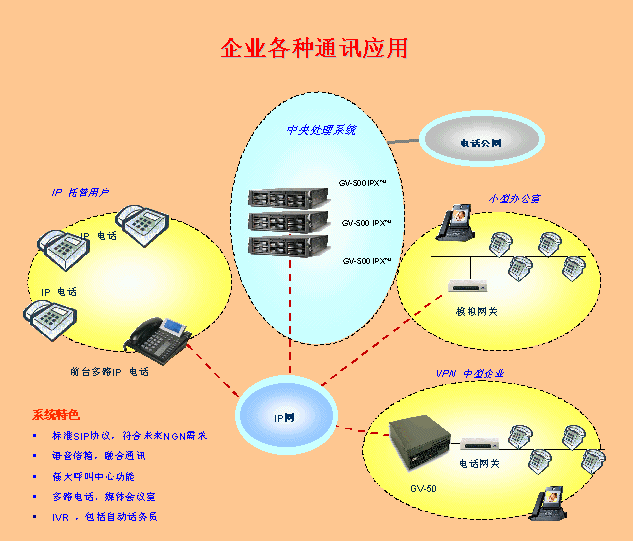 將訊時(shí)捷?IPX放在公司總部,其它分支機(jī)構(gòu)可以通過(guò)IP話機(jī),軟電話或者網(wǎng)關(guān)設(shè)備登錄到總部的IPX上,這樣就形成了整個(gè)公司的VOIP網(wǎng),建立了企業(yè)自己的通訊平臺(tái)。