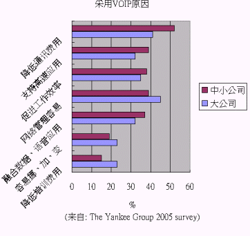 根據(jù)美國(guó)著名的咨詢公司 The Yankee Group 2005 年的調(diào)研各企業(yè)使用VOIP的原因,大企業(yè)與中小企業(yè)略有差異:大企業(yè)認(rèn)為網(wǎng)絡(luò)管理、省錢、促進(jìn)工作效率為最關(guān)鍵的三個(gè)原因;中小企業(yè)則認(rèn)為省錢、網(wǎng)絡(luò)管理容易、支持高速應(yīng)用、促進(jìn)工作效率為主要原因。
