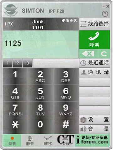 企業(yè)版需要另行購買,突出的功能包括“電子通信錄”、“軟電話與臺式電話機(jī)綁定”等。“電子通訊錄”功能已預(yù)裝在軟電話中,就像手機(jī)的通訊薄一樣。企業(yè)的員工不需要自己逐條輸入通訊錄,錄入與更新由企業(yè)的系統(tǒng)管理員在企業(yè)的通訊服務(wù)器上進(jìn)行,一人操作,全公司通訊錄同步更新。一個集團(tuán)公司或政府機(jī)構(gòu)有成百上千個員工很正常,但要讓大家記住這幾百個電話號碼就很困難了,目前較為常見的解決辦法有以下幾種,小一點(diǎn)的企業(yè)或機(jī)構(gòu)通常會打印一張通訊錄發(fā)放給每個員工,員工撥號前會先查一下這張通訊錄然后再將電話號碼在臺式辦公電話機(jī)上逐個輸入;規(guī)模大一點(diǎn)的企業(yè)會專門印制一本通訊薄發(fā)給每個員工,但由于機(jī)構(gòu)龐大,往往等到通訊簿發(fā)到手上,其中有很多電話號碼已經(jīng)不正確了。F20型軟電話的“與臺式電話機(jī)綁定”功能就很好的解決了這個問題,通過將電腦上的軟電話與辦公桌上的臺式電話機(jī)進(jìn)行綁定,企業(yè)中的所有員工在打電話時,都可以先點(diǎn)擊電腦軟電話中的通訊錄,快速找到需要的電話號碼,然后只需點(diǎn)擊這個號碼條,這個員工的臺式電話機(jī)就會自動向目標(biāo)電話進(jìn)行撥號,待對方摘機(jī)后,這個員工的臺式電話機(jī)就會響起鈴聲,此時摘機(jī)就可進(jìn)行通話了。確實(shí)夠方便,夠?qū)嵱茫?