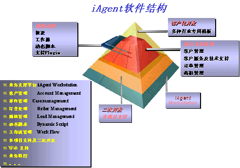 iAgent3.0從軟件內(nèi)部的結(jié)構(gòu)體系上加以突破,統(tǒng)一開放的應(yīng)用平臺(tái)上組合功能強(qiáng)大的二次開發(fā)工具,并在此基礎(chǔ)上加以針對(duì)行業(yè)而特別設(shè)計(jì)的功能模板。更好的適應(yīng)了企業(yè)處理流程的多樣化和需求的復(fù)雜化,并為企業(yè)高速的業(yè)務(wù)增長(zhǎng)和功能需求增長(zhǎng)帶來(lái)極大的拓展空間。軟件結(jié)構(gòu)如下圖所示: